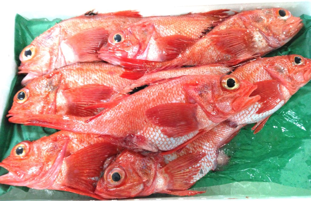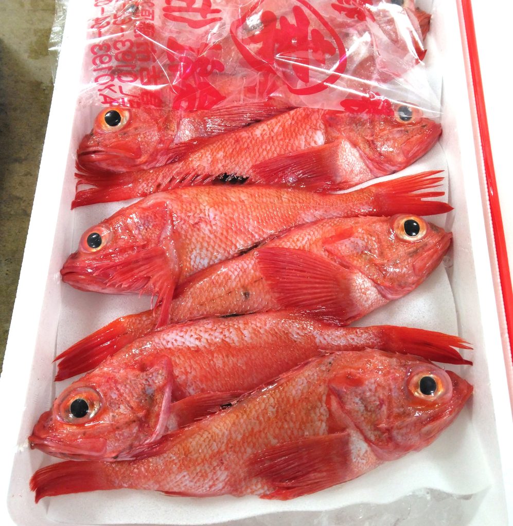 西がノドグロなら、東はこれ、という魚。キンキです。盛岡市場に入荷するキンキはほとんどが宮古産で、この魚もその通り。9尾入りの4.5キロだったんですが、箱書きには「B」の文字が。B級グレードのこと? 魚を良く見るとお腹が膨らんでる。担当者に聞くと抱卵したものだけをあつめた規格らしい。魚の結構な部分を卵が占めるので、身だけの魚体よりも、キロ単価はだいぶお安め、とのこと。卵自体にはあまり価値が無い、という事なんですかね。じゃ、卵は食べられないのか、というと、そうでもないんだとか。煮付けにすれば結構うまいらしいけど、卵を煮付けるくらい魚を大量に買うわけ無いし。そう大きくはない卵をどう食べればいいのか、調べてみましたよ。塩を振って焼くのが一番簡単だけど、小麦粉をまぶして揚げ焼きにする、のがおすすめみたいです。最近卵を抱いた魚の姿もちらほら見かけるようになりましたね。先日のマゾイほどのものはなかなか無い…、と思ったら、今日もでっぷりマゾイ、入荷してましたよ。ついでですが、卵を抱いてないキンキも入荷してましたんで、写真だけどうぞ。宮古産の3キロ8尾入りです。