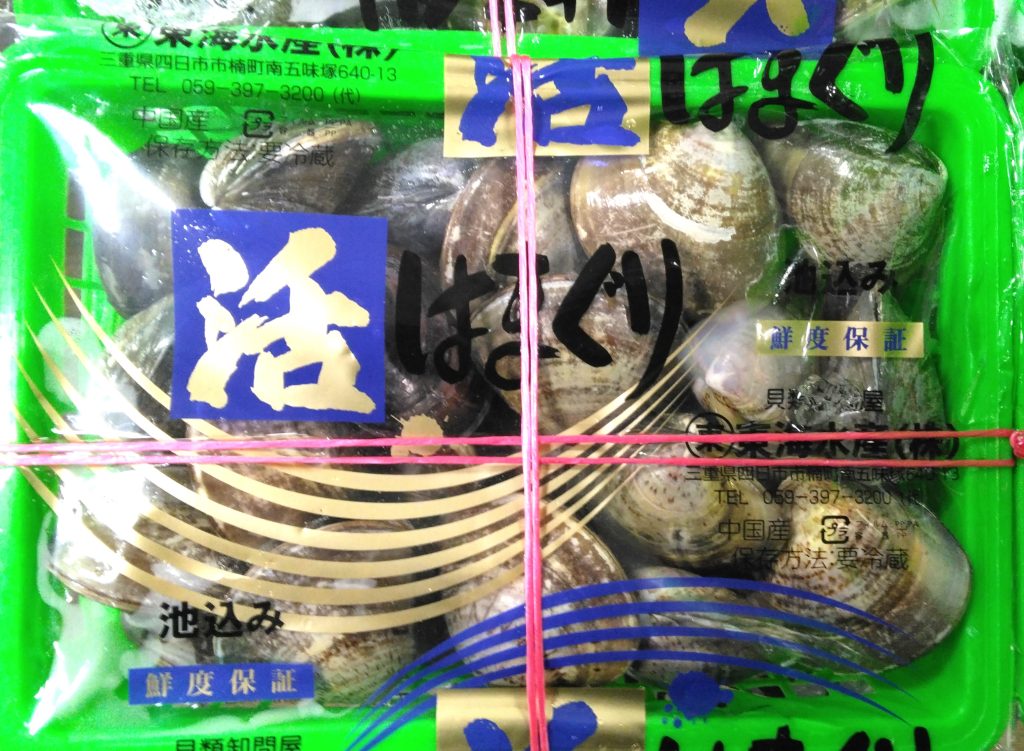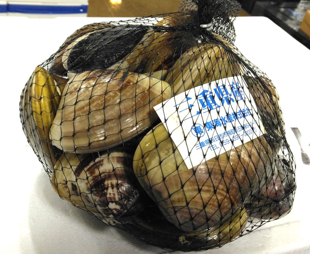 ひなまつりも目前、という事でハマグリです。なに?カゴの色が違う? そうでしたね。メーカーさんにもよるんでしょうが、カゴの色でサイズが判るようになってるんです。青はやや小さめのいわゆる量販サイズで、今朝の入荷では緑が一番大きいそうなので、緑をアップで撮ってみました。これはカゴ入りの中国産ハマグリで2キロ入りでした。フィルムに「池込み」とありますが、これは、中国から輸入したハマグリを一旦、キレイな海水の池に数日から一週間ほど入れて、貝の中の余分なものを取り除いたり、弱った体を回復させたりした後で出荷をしてるんだそう。だから「活」での流通が出来るんですね。もちろん国産のハマグリもありましたよ。ネット入りの画像をどうぞ。