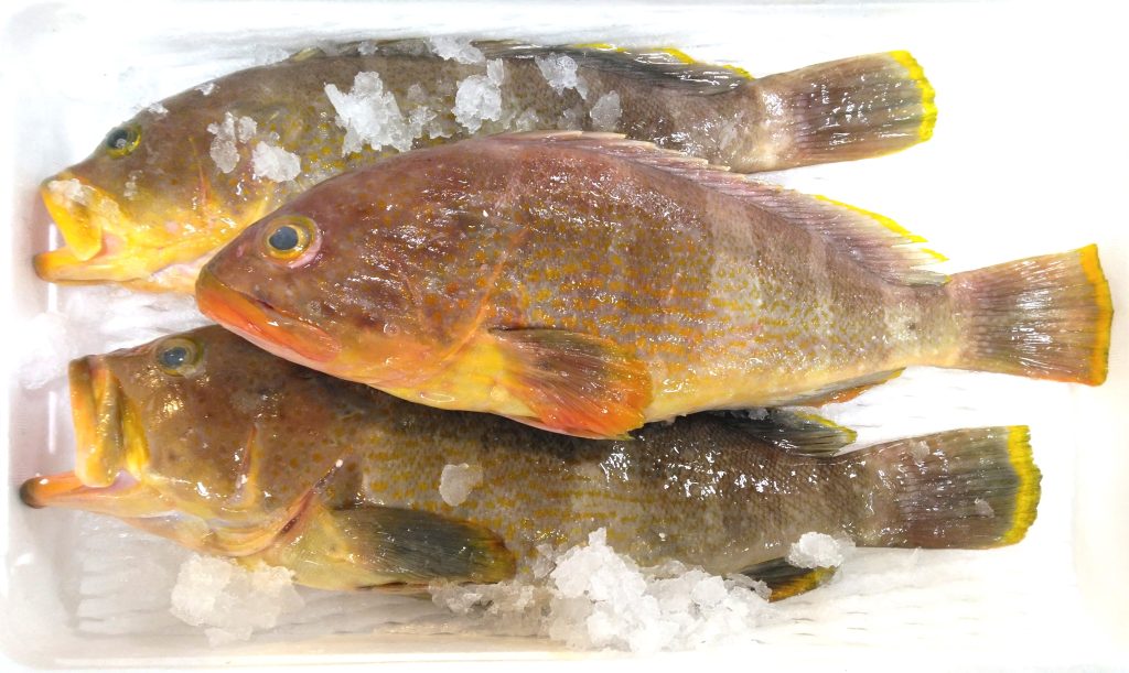 過去何回も売場で見かけてます。ネタとしても取り上げてるはず。箱には「黄ハタ」の文字が。長崎県産の釣りもので、3尾入りの3.4キロでありました。いつだっけ?前にやったの。キハタで検索したけど出てこない。あれ?違う名前だった? ブログでやってないはず無いし。念のためネットで調べてみると、標準和名はアオハタ、と出た。アオハタで検索すると今年の4月に取り上げてましたね。その時はアオナ、と言う名前で入荷してたよう。全然覚えてないわ。だいたいこの黄色い見た目で、どこがアオハタやねん。文句を言ってもしゃーないか。で、このアオハタ。やはり小型の部類らしく、ハタにしては鮮度落ちが早いんだそう。ハタ、といえば日持ちするイメージだけどね。そういう訳でおすすめは、焼きものに揚げもの、煮魚に鍋、そんなところでしょうか。鮮度が良ければ刺身も、ですけれど、高鮮度だと身が硬いんだとか。刺身以外のフルコースがおすすめですかね。こちらは日本酒が合いそう。
