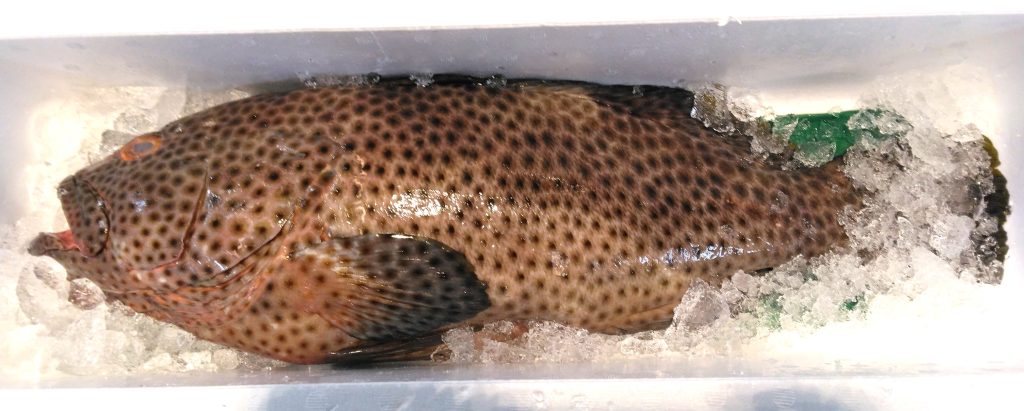 このデカい魚は、というとシロブチハタです。前回は2キロ無いぐらいのサイズでしたが、今朝のは3.1キロ。体長もゆうに50センチを超えてましたよ。あ、しまった。シロブチの由来、ヒレが白いんだっけ? この写真じゃダメだったか~。後悔先に立たず。ん、シロブチって、斑点の周りが白いだけだっけ。んじゃいいんだ、これで。見た事はあるんだけど、ネタとして採用したかどうかは、正直モリ介の脳みそでは不明。事務所に戻ってパソコンで検索して初めて分かったりする。種類も多いしね、お魚は。話を戻してシロブチハタ。前回も書いたけど、お値段も高いが味も絶品。ハタ類では小型に属するらしいけど、この大きさは別格じゃないですかね。脂ものってそう。刺身は甘いだろうな~。フルコースも行けそうですよ、このサイズ。お造りに焼き物に唐揚げに煮魚でしょ。最後は鍋。あるブログの記事では、刺身を食べたら辛口の白ワインが止まらなくなった、と書かれてました。あ~、贅沢やな~。