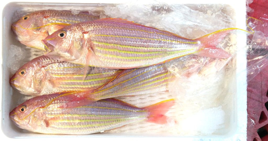 うん、相変わらずお美しいお姿でいらっしゃいます。長崎県産の釣りもののイトヨリダイ。6尾入りの4.2キロ。40センチにはちょっと届かないサイズでした。あ、もちろん黄色の糸のような尾びれはカウントしてません。それを入れたら60センチほどになりますかね。南方魚の水揚げ地が北上してるとはいえ、さすがに東日本産のイトヨリはまだ見てないような。その内獲れるようになるんでしょうか。モリ介としては、どんな魚かはぜんぜん知識が無かったんですが、すり身の原料としての名前は知ってましたね。たしか、東南アジア方面で水揚げがあったはず。そんな海域で生息する魚が、三陸で揚がったりしたら、それこそ地球が大変なことになってる、という事になるのかも。話によると、料理素材としては難しい部類の魚なんだとか。刺身ではあまり味が無いので、蒸し物や煮物がメインになるそうだけど、美しい皮目を活かす技術が求められるそう。ただ煮るだけだったらモリ介でもなんとかなりそうだけど、たぶん皮目はボロボロになるだろうな。