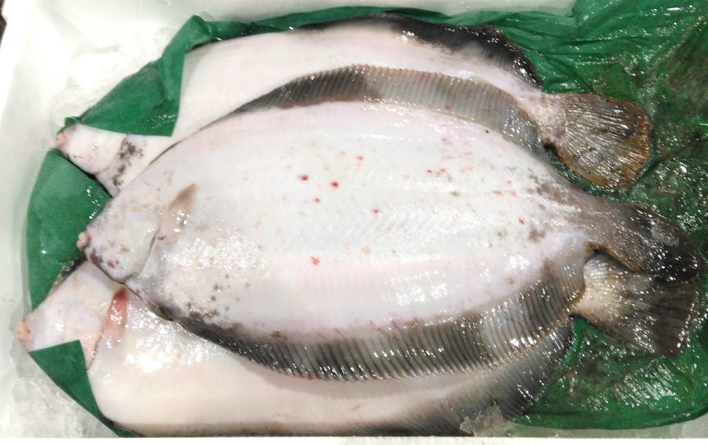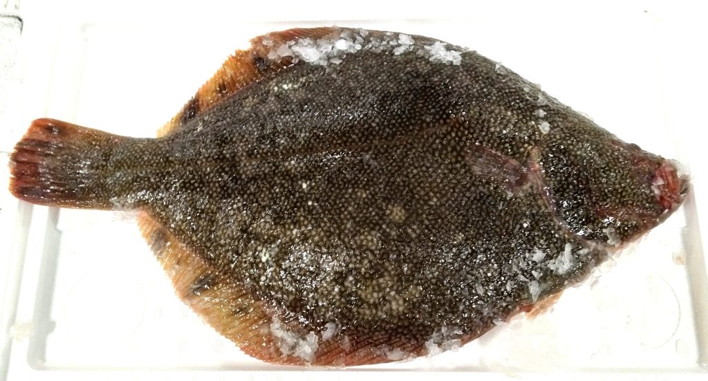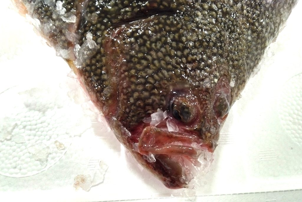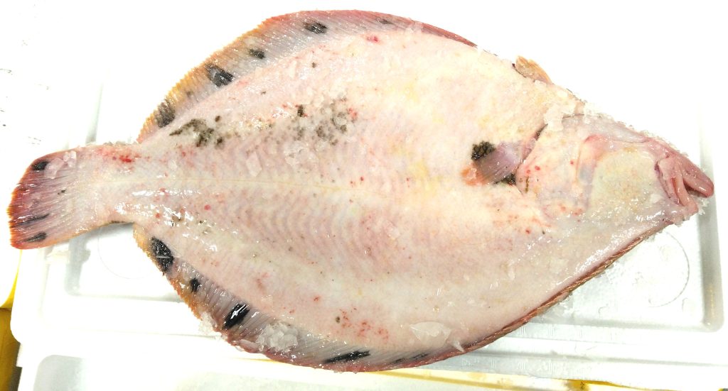 北海道は根室産のマツカワガレイです。体長は50センチの2.3キロでありました。こちらは裏側で眼がついてません。少々重たかったんですが、表側も撮影してみましたよ。