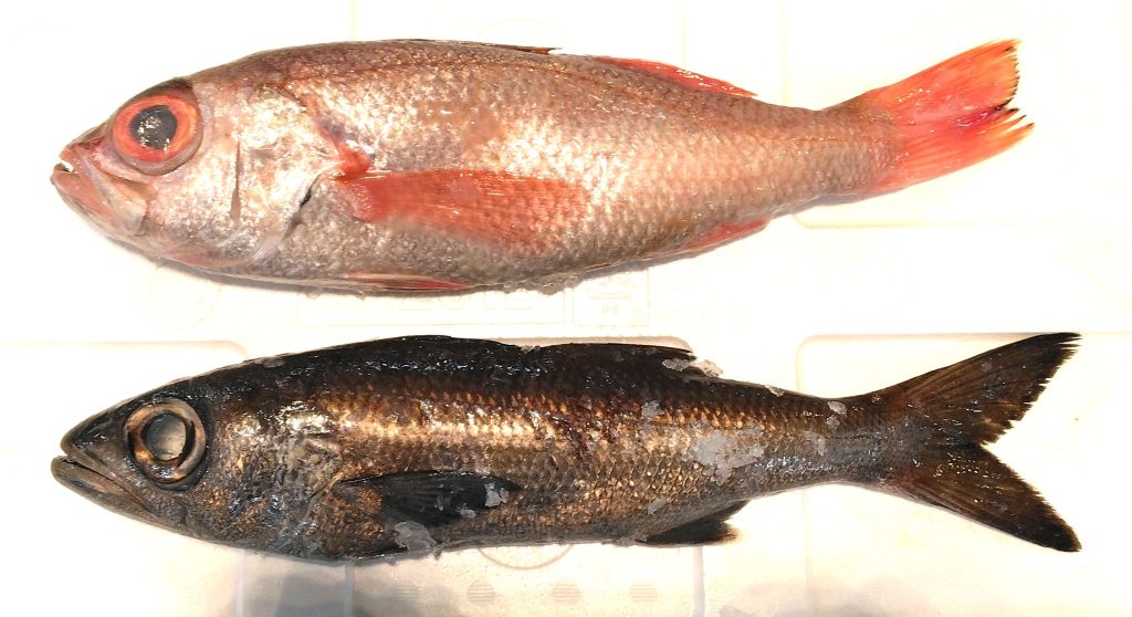 上の赤い方は先日も載せたばかり。そう、ご存じ日本を代表する高級魚のアカムツです。いわゆるノドグロ。で、下の方は、黒いヤツ、って言っちゃってるから、もうお判りでしょうが、クロムツです。この赤と黒、どちらも長崎県は対馬が産地。同じ網で混じって獲れるものなのかどうかは判りませんが、同じ産地で同時期に獲れるものなんですね。アカムツは6尾入りで4.5キロなのに対して、クロムツは8尾入りの6.2キロでありました。どちらも体長はおよそ40センチ。一尾あたりの重量はほぼ同じレベルだけど、アカムツの方が少々大き目に見えますかね。そんでもって驚きなのがその価格差。キロ当たりの差は、何と1万円。4キロ同士だったら、箱当たりで4万円差がある、という事。同じような名前の、色違いみたいな魚、ここまでの差が付くものなのでしょうかね。調べてみると、クロムツで入荷する魚の中には、生物学的にクロムツでない、ムツ、という魚も含まれることがあるらしい。大型の魚だと色の黒さでも見分けがつくことが多いけど、今朝ぐらいの大きさだと、エラの中を見ないと分からない、とのこと。クロムツは超高級魚らしいから、この価格差だと、「クロ」でない、ただのムツ、である可能性もありそう。脂のあるさまを「むちっこい」と言ったことから「ムツ」と名前が付いた。そんな説もあるようだから、脂がのってることは間違いない。アカムツよりも全然お安く頂けるなら、クロ、の選択肢もありそうですね。ただもっと旨いのはキンキですからね。宮古からガッツリ入荷中でしたよ。