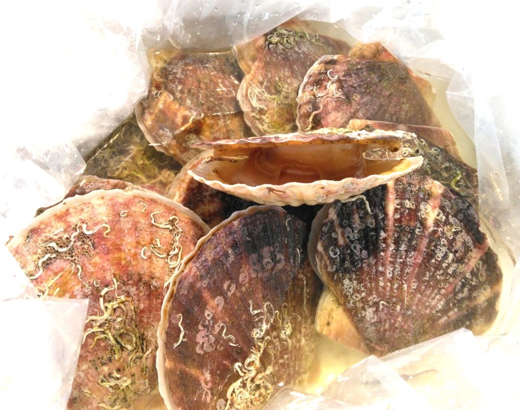 北海道は根室産の天然ホタテ貝です。貝の直径は20センチ弱で、中に見える貝柱は7センチほどに見えましたよ。刺身にしても、絶対に食べ応えがあるヤツ。これ以上のものって、そうは無いはず。お値段は…、安いはずが無いですよね。市場で扱うホタテ関連の商材は多岐にわたります。貝のままの商材は皿貝とも呼ばれて、天然ものと養殖ものがあり、そこから生のままむき身にしたものや貝柱だけにした商材もあります。他には冷凍品。大きくはベビーホタテとボイルホタテと冷凍貝柱。主な産地もそれぞれ異なっていて、ベビーは青森県のむつ湾、ボイルホタテは北海道の噴火湾、貝柱はオホーツク海沿岸、と分かれています。ざっくりと、ですけどね。あ、そうだ、ベビーも生の貝つきやむき身もありましたね。また、処理の仕方で加熱用と生食用が分かれてます。これに輸出や、輸出もの特有な貝の形態とか、とにかく色々とあって全体は良く分からない。お隣の大国向けの輸出は現在停止中だけど、価格が下落してる話はあまり聞こえてこないし、むつ湾は高海水温で壊滅的な打撃を受けてて、ベビーホタテの出回りは極端に絞られてる。ベビーなんて、昔はチルドのまま、量販店にガンガン流れてたんですけどね。年末にはホタテ、食べられるんでしょうか。