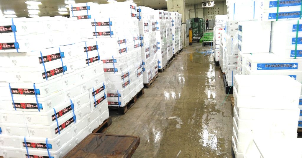 左側はスケシラコの壁で、右側はナメタガレイの壁です。例年だと11月ぐらいからしばしば見かけることが出来たスケシラコウォールですが、今年はこれが初めてかも。ちなみにスケシラコは壁の陰にも3パレットぐらい。そして奥に見える太い柱の向こうにも、売約済みのパレットが3個ほどありましたよ。スケシラコについてはわかりませんが、ナメタガレイについては、休市明けぐらいから壁の状態が続くを思われます。その時にはネタにさせてもらいますね。もちろん中身もお見せしますよ。