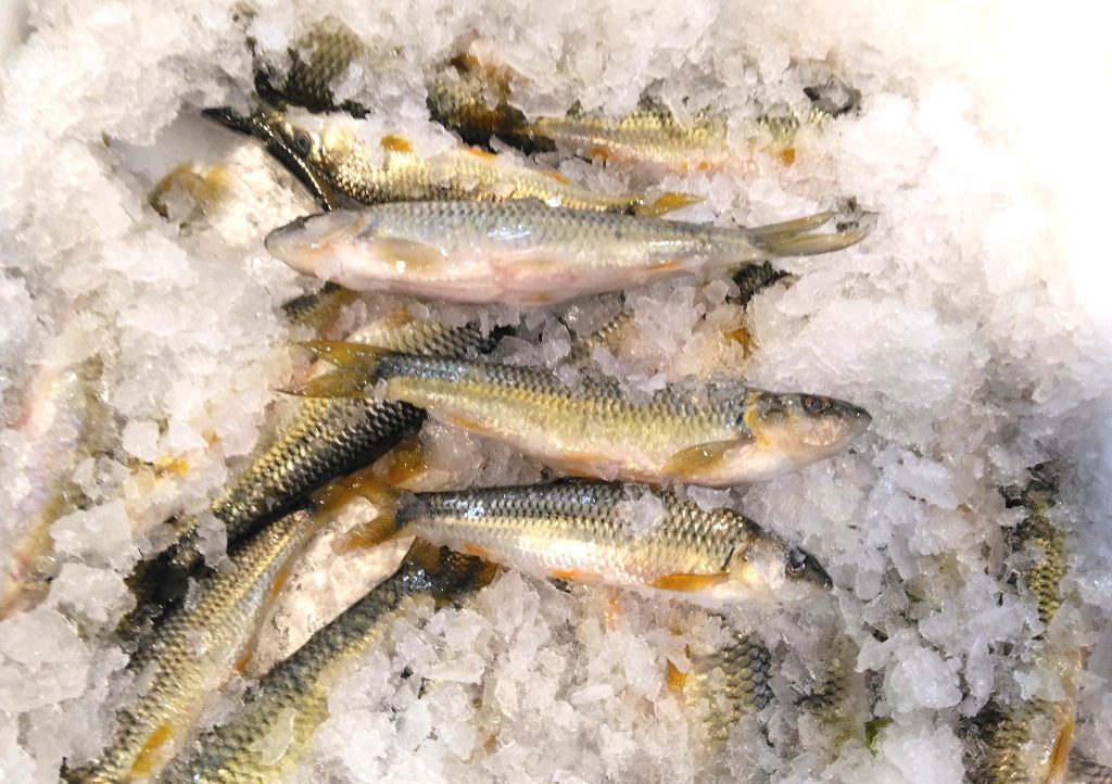びっしりと氷漬けになってたので、傷を付けないように掻き出してみました。体長は10センチ前後。500グラム入りでした。その500グラムの小箱が数箱入った大箱の横に書かれてた文字は「ヒカイ」。なに?ヒカイって。仲卸さんによれば、見た目ホンモロコかと思った、とのこと。モリ介は、ホンモロコも良く分からない。小魚だという事はなんとなく分かるけど。担当者に聞くと、ホンモロコとは違う魚で、ビワヒガイ、という魚なんだそう。う~ん、初めて聞いた名前だよ。調べてみると、琵琶湖固有の魚だそうで、大きく分類すると、コイの仲間なんだとか。なんか似てる気もしますね。明治天皇のお気に入りの魚で、日本各地に移植されたこともあるという。でも正直評価は高くないんだとか。焼いて生姜醤油で食べると旨いけど、独特の風味があるそう。どんな風味なんだろ。心配だったら甘露煮がいいかも。