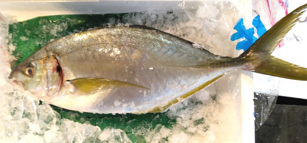 高級魚のシマアジです。市場入荷には養殖ものも多いんですが、これは高知県産の天然もの。体長60センチの2.6キロでありました。大きい魚体だと、1メートルほどになることもあるそうですが、そこまでの個体はまず見かけませんね。何人ものお客さんが、その大きさに見入ってたくらいですから、これでも十分に大物かと。調べてみるとやはり、1キロを超える魚はまれなんだそう。大型のシマアジは、釣り人の夢なんだとか。たしか先週も入荷があったと記憶してるけど、30センチ無いぐらいのサイズだったかと。養殖ものも以前に取材したことがありましたが、背の部分の色が全然違いますね。養殖はもっと黒っぽい感じでした。モリ介は良く分からないけど、もう一つ違うのが、天然の方が目が小さいんだとか。脂はあるけど後味のよいすっきりとした味わいのシマアジ。ぜひお刺身で召し上がっていただきたいですね。