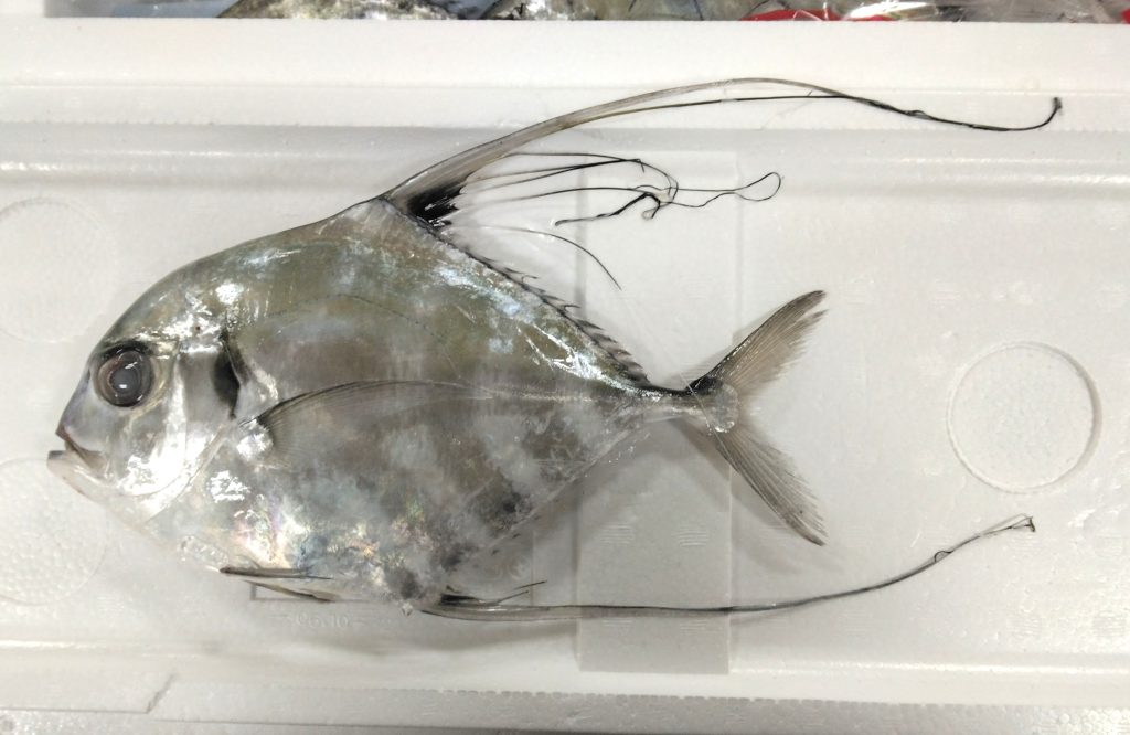 ウマヅラの前に一度写真を撮ってたんですが、今度は箱から出てきて頂いて、糸のように伸びたヒレを伸ばして撮影しました。この魚はイトヒキダイ。大分県産の15尾入り、4.1キロでありました。体長は20センチちょっと。体長以上に伸びた糸状のヒレが特徴です。調べてみると標準和名はイトヒキアジ。え?タイじゃないの?という事は、お二人は親戚? 調べてみるとそう遠くない親類のようですね。ウマヅラアジと同じく、成魚になるにつれて、糸のようなヒレは短くなり、魚体が長くなってくるんだそう。成魚になると旨味も増すそうですが、幼魚のうちは、三枚におろした後、皮を炙って、皮付きのまま刺身にすると旨いんだとか。それにしても、ぺったんこの魚体。三枚おろしって難しそう。初出しの魚の親戚の、これまた初出しの魚を同日にご紹介できるとは、珍しい事もあるものですね。それぞれの魚は担当者も部署も全く違うんですよ。本当に偶然です。こりゃ今日はいい事があるかも。パチンコでバカ当たりしたりして。って、モリ介は一切ギャンブルはやらないんですが。
