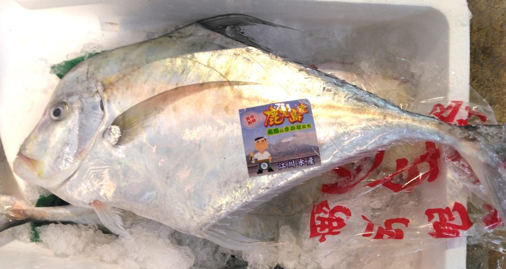 この魚はウマヅラアジ。ウマヅラってハギだけじゃないの? お客さんがお買い上げになって、少々お待ち頂いての写真撮影でした。なんかカクカクした魚体で特徴的。60センチを超える大きさの、鹿児島県産の2尾入り、5.9キロでありました。調べてみると九州、沖縄では珍しい魚では無いそうで、強い旨味をもつ刺身がおすすめ、とのこと。この魚は成魚なので見る事は出来ませんが、幼魚のうちは、背びれや腹びれが糸のように伸びるんだそうです。大きくなるにつれてどんどん短くなるんだとか。