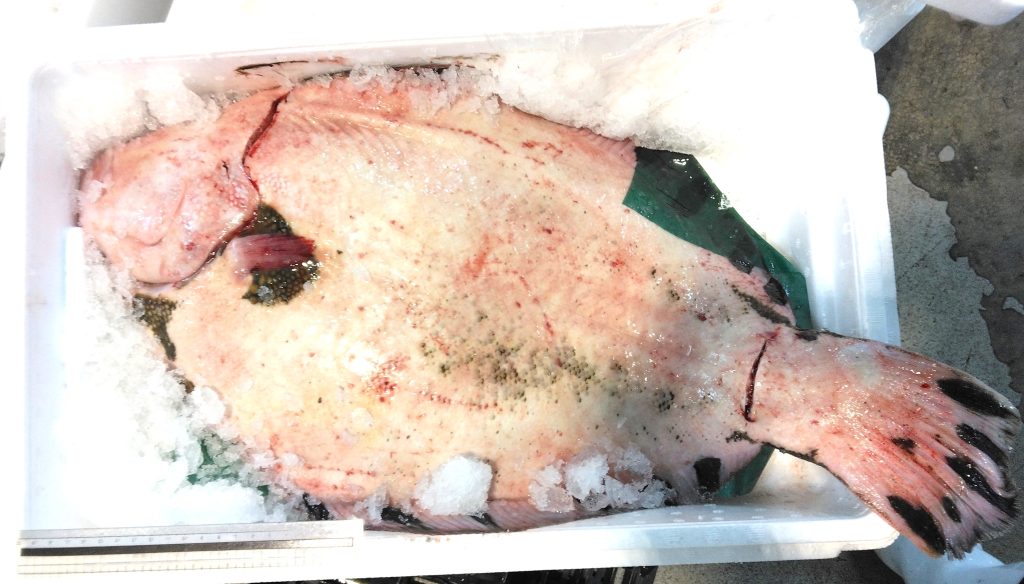 そしてお次のネタは、先月も活魚を載せたんだけど、今朝はとにかくデカいサイズを見つけたので、それをご覧いただきましょう。すみませんが、裏側だけね。目のある方は、というと、裏返しは断念しました。重そうだったし、活締めで切れ込みが入っていて、なんか尾がちぎれそうに見えたんですよね。そもそも両手で抱えないと無理な大きさだから、軍手から作業着の袖まで血まみれ確定でしょうから。