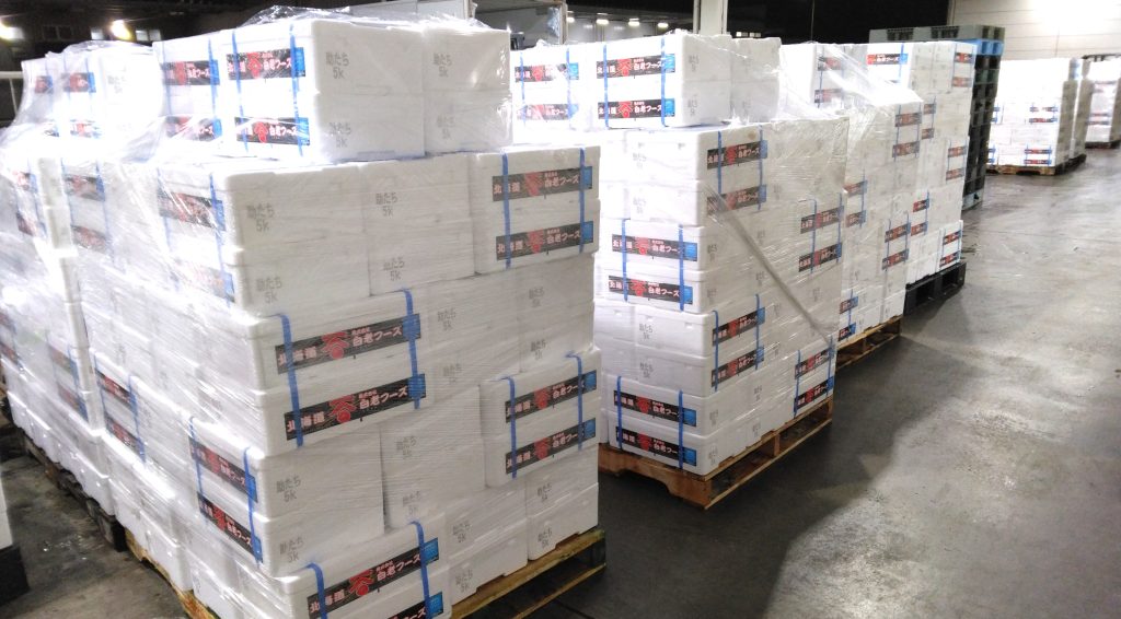 それでは連休前の卸売場へとまいりましょうか。中に入る前のホームには、年末にも見かけたビル群が。これは後半にお届けすることにしまして、これは旨そう、という見本がありました。まずはそれをご紹介。
