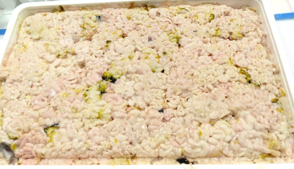 北海道は白老産の5キロ入りです。担当者によれば1月にこれだけまとまって入荷するのは珍しい、とのこと。例年は12月あたりに良く見られる光景。今年は今頃になって漁獲がまとまっているらしい。ひと月ぐらい遅れているイメージなんでしょうか。ちなみに漁獲されたスケソウダラは、身の部分はすり身やフィーレ等で加工に回され、卵はもちろんタラコへと加工されます。白子だけが生鮮品として出荷されている、とのこと。財布のヒモが緩みやすい年末に入荷してくれればいいのに~。とはいえ魚に年末も年始もないか。寒さピークの昨今にピッタリの鍋商材ですので、ぜひお店でお買い求めください。あ、年末は中身を見てなかったので、今朝は中身の写真を載せましょうかね。