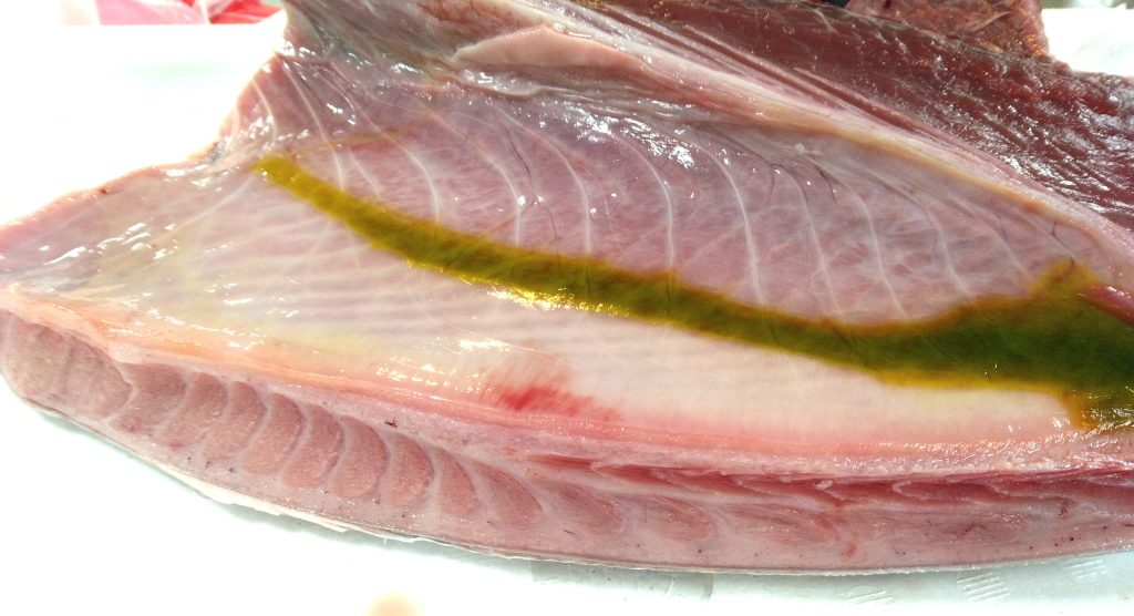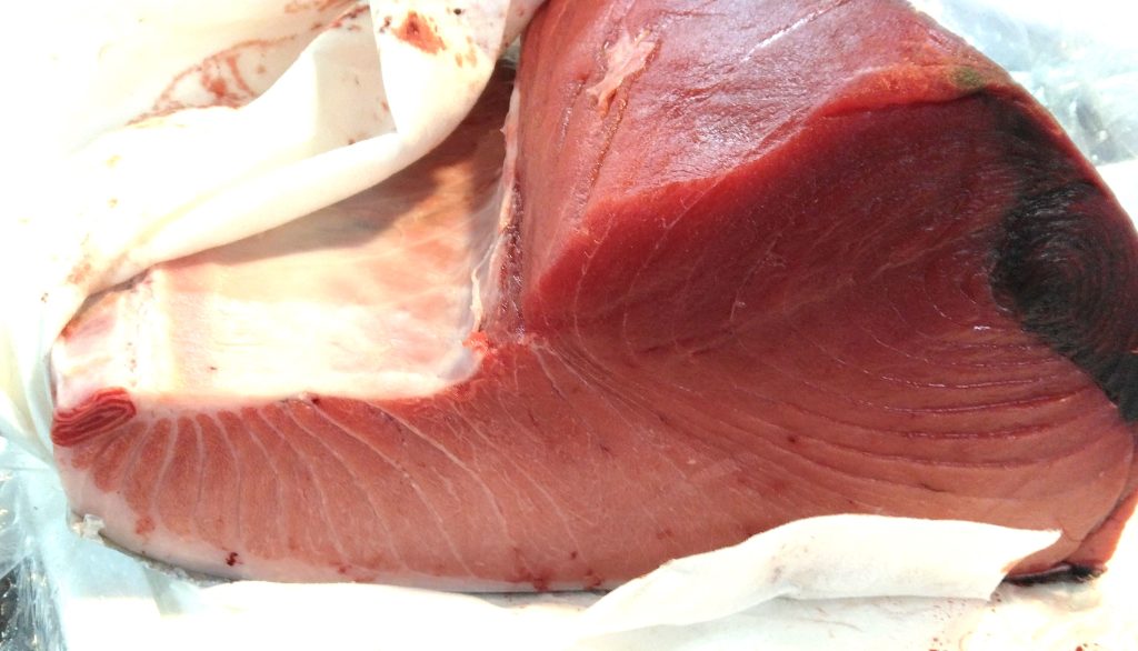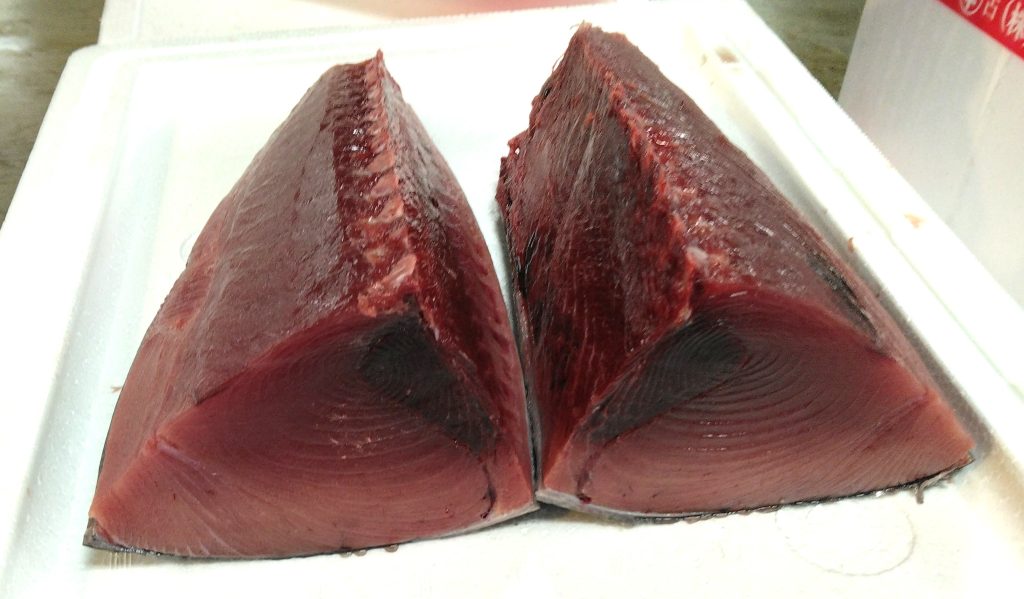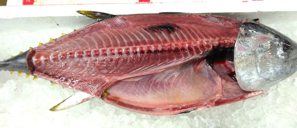 宮古産のメジマグロです。体長は1メートルちょっと。定置網にかかった魚のようですね。この写真は身の部分を切り出した残りの半身。で、肝心の身の方は、というと…。