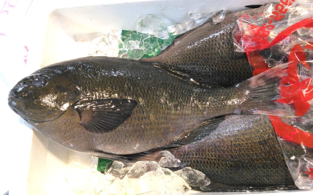 和歌山県産のメジナ。箱には”活〆グレ”の文字が。3尾入り4キロでありました。実は先々週にも一旦は取材をしてまして、その時は保留の扱いだったんですが、やっと出番が回ってきました。断っておきますが、その時の古い魚ではないですよ。その後も断続的に入荷が続いてましたね。このメジナ、旬の時期は秋から春だそうですが、春になって卵を持っても、身の脂が少なくならないんだそう。なので春が一番旨い、と言われてるんだとか。刺身、焼き魚、煮魚と何でもいけるオールラウンドタイプ。ぜひお試しくださいね。そうそう、昨年の取材時に、目の色が特徴的、と分かったんだけど、写真を撮った後だったので、載せることができませんでしたが、今回は忘れずに画像を押さえましたよ。