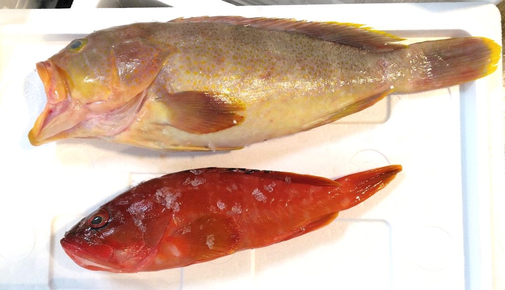 上の魚は先月もやったんだよね。だからちょっと掲載順としては後回しになってました。赤い方は、初夏以来でしょうか。黄色い方は長崎県産のキハタ。3尾入りの3.3キロ。体長は約40センチと大型。一方赤い方はアカハタ。東京は三宅島産の釣りもので、10尾入り、4キロでありました。体長は25センチほどと、まずまずの大きさでしょうか。キハタの標準和名はアオハタ。黄色いのに何で青なんだ、というのは、何度もやってるんでここはスルー。実は箱には「アオナ」って書いてあったので、またもや初出し物か、と、勝手に色めきたっちゃった。調べてみたら、キハタのアオハタだ、ってなって、この間やったばかりじゃん、と意気消沈。姿だけじゃわからないよ。ところが近くのパレットに、アカハタを見つけて、並べて撮ったらネタになるかも、となった訳だけど、他にも色々とネタがあって、やっと今回の掲載、と相成った次第。どちらも高級魚ではあるけど、温暖化傾向で、漁場も北上中らしい。三陸あたりでも、バンバン揚がる魚になってしまうかも。その時は「昔は遠方の魚でお値段もお高かったんですが…」なんて記事が掲載されているでしょうかね。
