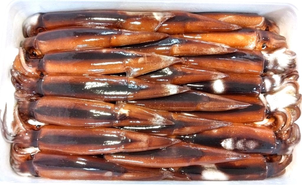 う~ん素晴らしいお姿。素材集にも使えそうな感じでしょ。ところでなんで1箱だけ? もしかして産地が違う? 担当に聞いてみると…。「宮古産です。」 ハイハイ来ましたね。釣りもののスルメイカ。20尾サイズであります。青森産の20尾サイズは、1パレット分入荷してましたが、県内産はまた別物。見た目は全く同じに見えましたがね。ところで、ちょこっと前にニュースでも流れてました。福島県は相馬漁港に揚がるスルメイカが豊漁だ、という話。地元のお店では、冷蔵ケースに並ぶのと同時に、片っ端から売れていく。鮮度も抜群、とのコメント。だけどイカが真っ白。どうやらトロールで漁獲されたものらしく、北三陸産の黒々とした様子ではないんですよね。釣りものの黒々とした姿が当たり前の岩手、青森では、白い見た目のトロールものだとちょっと厳しいかも。こちらだと加熱用のイメージになってしまうんですよね。皮を剥いたら見た目は同じなんだけど。