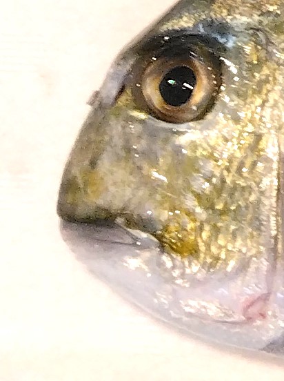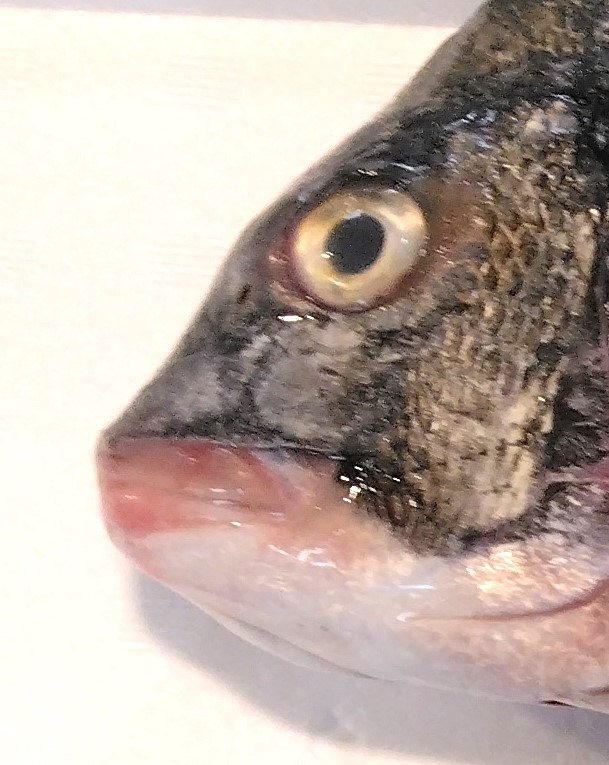 前にもやったんだっけ? この比較。何?半年前? 書いた人間が忘れてるんだから、読む人は絶対に覚えてねーよ。えと、上がクロダイで下がヘダイです。でも前回は並べて撮ってはなかったよね。前にも書いたけど、頭の丸みと、色の濃さと、口元が違いますね。口元だけど、写真を拡大してみましたよ。まずはクロダイ。