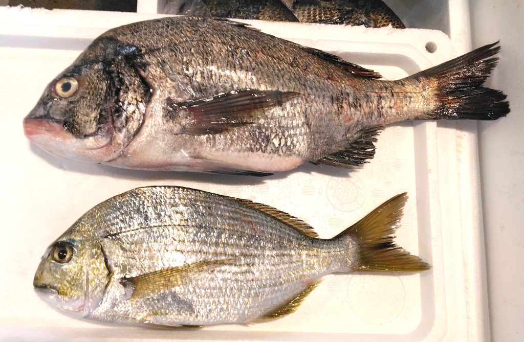 口元がぐにゃ、っと曲がってますよね。「へ」の字に曲がってるのでヘダイ、となった、という名前の由来でもあります。売ってる部署が違うので、こういう写真の撮り方、大変なんですよ。商売の最中に品物を借りてくるわけだから。正直言うと、モリ介が営業担当だったら、イライラしてしまうかも。だって、来てくださるお客さんとの商売は、ある意味タイミング。品物を貸してる間に、売り時を逃したらどうすんの。すみませんね~、出来るだけ早く返しますので、多少お時間をいただきたく。ちなみに、クロダイは岡山県産の4尾入り5キロ。体長は40センチ。箱には「チヌ」と書かれてました。クロダイの別名ですね。西の地域ではチヌの方が普通なんだとか。そしてヘダイ。こちらは大分県産の5尾入り3キロ、体長30センチ、でありました。前にも書きましたが、クロダイの人気、あまりないみたいですね。西の方でも、マダイの方がはるかに人気が高いらしい。地域によっては安くても売れない魚、という評価の所もあるんだとか。え、高級魚じゃなかったんだ。盛岡ではそんなことはないようですが、比較的お買い得なお魚かもしれませんね。お店で見かけたらぜひ、お手に取っていただきたいかと。
