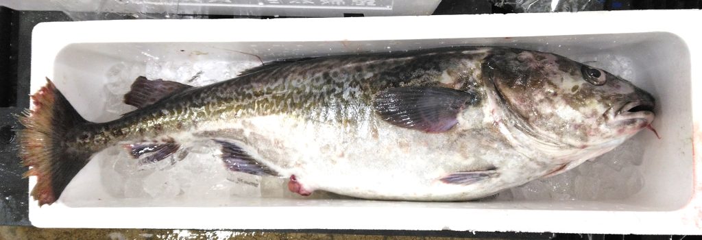 色の感じからするとシロアマダイのような色。だけどフォルムが全然違う。この魚はヒゲダラ。新潟県産の3尾入り2.5キロでありました。前回の掲載は昨年の9月。確かにめったに見ない魚かも。アゴに数本のヒゲがあって、前回もアップを撮り忘れた、と書いてましたが、今回も忘れました。画像をアップにしてみたけど、ないな~、ヒゲ。肌にくっ付いてるのかしらん。標準和名はヨロイイタチウオ。ヒゲはわかるけど、なんでタラなんでしょうかね。全然似てないのに。調べてみると、少ないながら太平洋側でも獲れるらしいけど、新潟とか山形以外からの入荷は、見たことが無いかも。関東では人気のある魚だそうで、そのせいで盛岡にはあまり入ってこない、こんな可能性はありますね。人気の料理は昆布締め、とのこと。手間がかかる贅沢料理ですな。せっかくだから、ヒゲダラとは似ても似つかぬマダラも載せますかね。これも昨日の取材から。