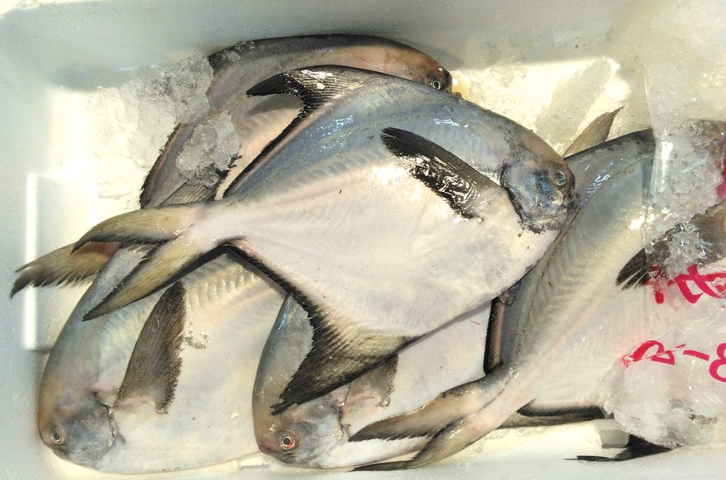 関東以北ではそこまででは無いですが、西日本では珍重される高級魚、マナガツオです。山口県は萩産の5尾入り3キロでした。体長は30センチほど。半年前の50センチの大物にはほど遠いですね。という事はまだ若い魚? 調べてみると、若い魚の特徴として、上下に分かれてる尾びれだけど、若い魚は下の方が長いらしい。体が大きくなるにつれて同じ長さになっていくんだとか。写真の魚はほんの少し下側が長く見える。成魚だけどまだ若い、ってことですかね。人間だと22歳ぐらい? モリ介の22歳は、思い出したくないくらい暗い時期でしたね。就職活動も思ったようにいかないし、大学卒業の心配も少しだけどあったし。自分のダメさ加減を思い知らされた時期でした。世の中バブルが始まってましたが、まるで自分だけ取り残されてた感じ。あれ、何の話でしたっけ? そうそうマナガツオ。まだ若いけどベテランの域のバイヤーさん、お!と一言発してお買い上げでしたよ。