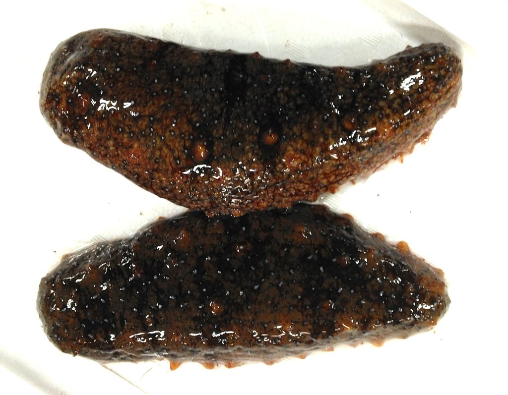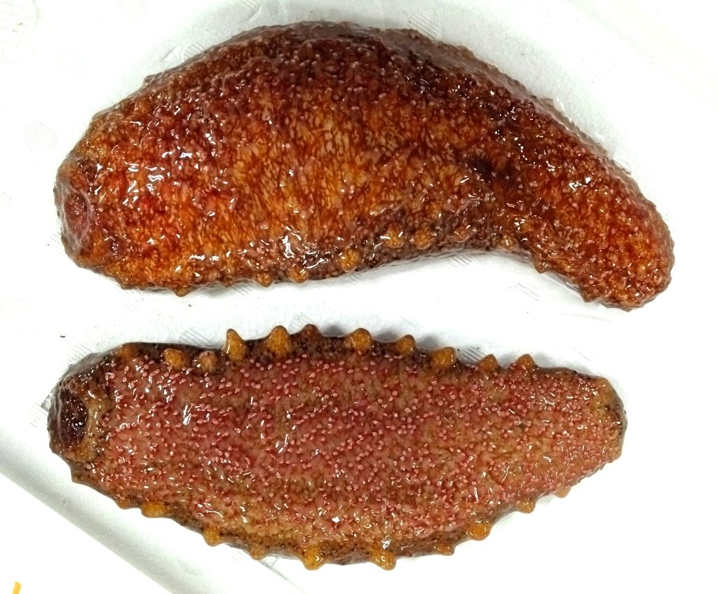 もう少し実物は鮮やかな赤なんですけどね。ま、一応赤いのはお判りいただけるかと。前にも書きましたが、普段よく見かけるマナマコよりも高値で取引されるアカナマコ。その理由は…、どうしてですかね。調べてみると、外洋に面した岩場にいるのがアカナマコで、内湾の砂地にいるのがマナマコだそうだけど、身の締まり方が違うみたいですよ。当然アカナマコの方が身が締まってるんですが、特に関西方面の市場での評価が高くて、それが相場全体に影響を及ぼしているらしい。最も身がやわらかい、とされているクロナマコでも、十分に身が締まっている気がしますがね、モリ介としては。モリ介一家では、歯が丈夫でない人間が多かったので、子供時代はほとんど食べた事はありませんでした。大人になってからは、食べる機会もありましたが、正直そんな感動も無かったですかね。旨いには旨いんですが、本音を言うと、奥歯の詰め物が取れそうで怖いです。