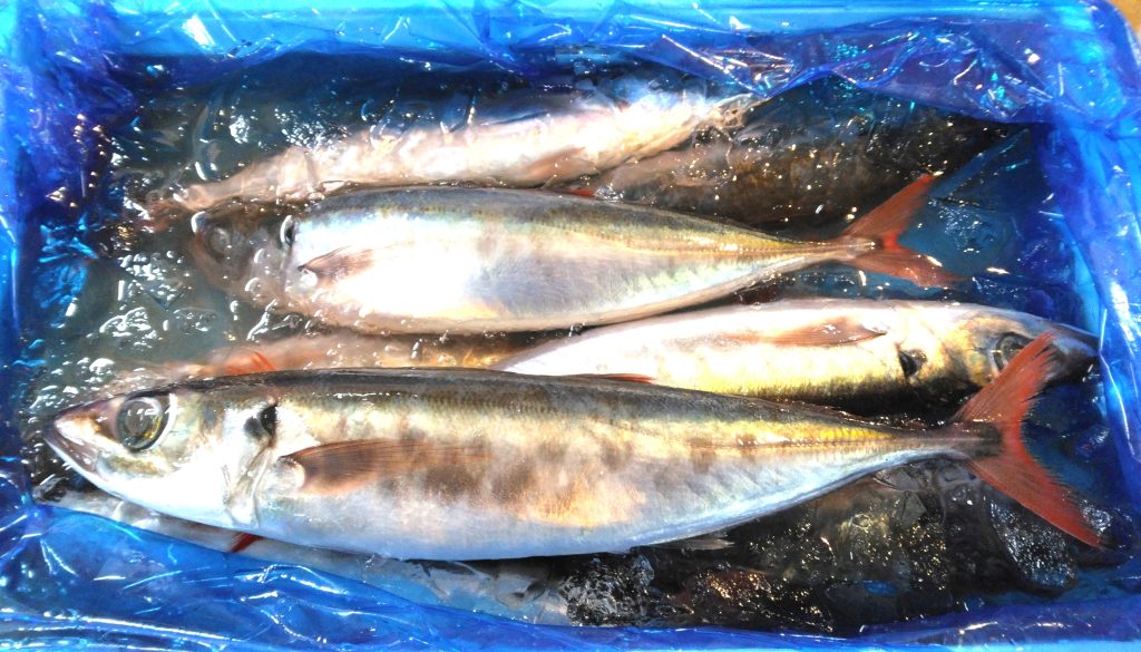 尾びれが赤いですね。この魚はオアカアジ。標準和名はオアカムロというんだそう。この業界で、オアカムロってあまり聞いたことが無いけど。高知県産の4キロ8尾入り。体長はちょうど35センチでした。旬としては秋口から冬にかけてらしいけど、寒い時期の方が脂がのっているらしいですよ。これまで毎年9月頃のご紹介が多かったけど、もしかすると脂が乗り切る前だったかも。今の時期だったら間違いなく脂たっぷりかと。そういえば昔読んだブログで、所用で訪れた盛岡の居酒屋で食べたオアカアジの旨さが忘れられない、という内容を読んだことがありました。時期はたしか、年末だったかな。おそらく西の産地からの入荷でしょうから、当社の仕入れだったかもね。有名ブロガー(モリ介は知りませんが)がこう言ってるんだから、お店で見つけたら迷わず買うべし。