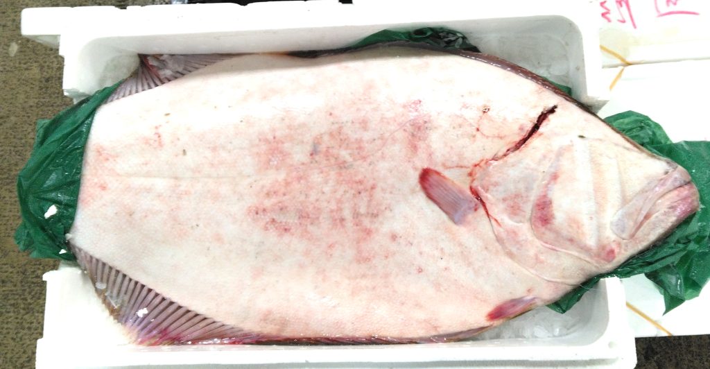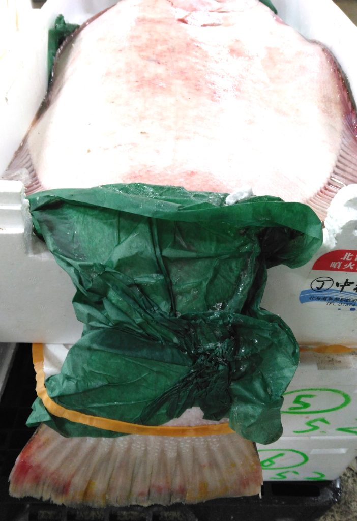 尻尾はパーチに巻かれてぶら下がってました。パーチを剥がして見たかったけど、凍り付いて剥がれない。この魚、体長は1メートル弱で、キロ数は9.3。噴火湾で獲れたもののようです。一般的に大きい魚の方が身の味はいい、と言われますが、ヒラメもこのぐらいの大きさになるとどうなんでしょうか。この魚を見ていたお客さんも、首をひねっていましたよ。調べてみると、ヒラメって、大きすぎると、身が筋肉質になって硬くなり、旨味が抜けやすいんだとか。なので寿司店さんとか料理屋さんあたりでは敬遠するそうですよ。なんでも50センチ程度がちょうどいいらしい。メートル級のヒラメで旨い部分を挙げるとするならば、そればエンガワなんだそう。そうか、デカきゃいいってもんじゃないんですね。果たしてどのくらいの値段でお客さんの所に引き取られたんでしょうか。意外とお安めだったのかも。