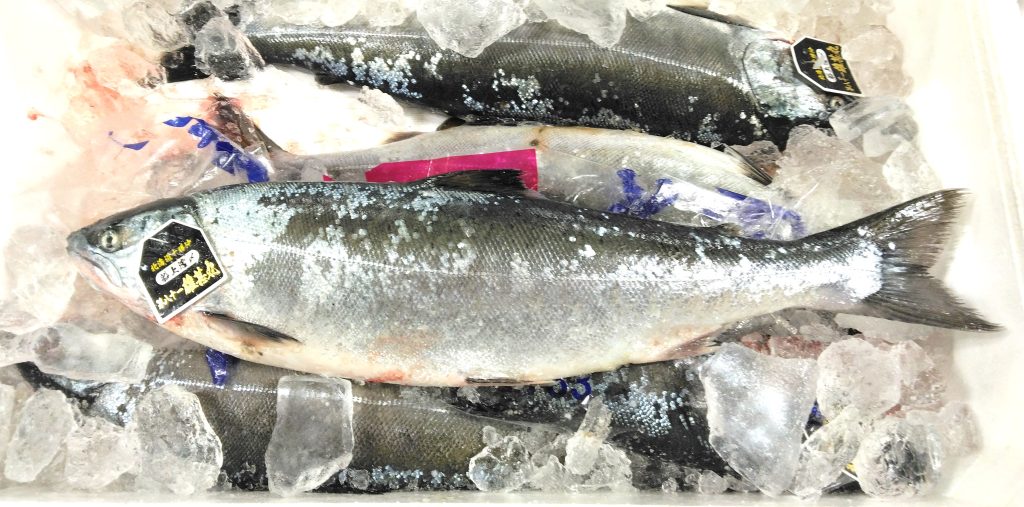北海道は十勝産のサクラマスです。箱には本マスと書かれてましたかね。ブランドのタグもしっかりとついてましたよ。5尾入りで5キロでしたから、1尾約1キロ。体長45センチほどでした。モリ介のイメージは、サクラマスといえばもう少し体の高さがある魚、でしたけど、この魚はそうでもないですね。となると困るのは、カラフトマスとの区別。今の時期にカラフトマスが揚がることはないでしょうから、心配し過ぎですかね。焼くとホクホクした柔らかい身が楽しめるサクラマス。旨味も甘味もサケ類ではトップクラスらしいですから、シーズン中一度は食べて頂きたいお魚でしょうかね。