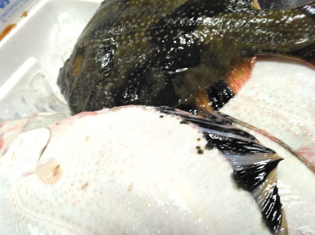 目の無い側にもありましたね、リベット。このリベット以外での、マツカワとの違いは、尾びれの模様。模様があるのがヌマガレイで、無いとマツカワガレイらしいです。味は、というと、ヌマガレイは旨味、甘味ともに薄めで、フライ等の油を使った料理と相性がいいらしいですよ。ま、食べておいしいのはマツカワ、となるんでしょうかね。この魚、函館産の6尾入り、5.6キロでした。体長40センチ超えのまずまず立派な魚体でありましたが、調べてみると、70センチオーバーになる事もあるらしいです。
