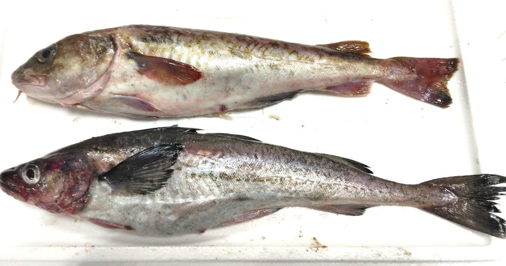 どちらがスケソウダラで、どちらがマダラかお判りでしょうか。正解は上がマダラで下がスケソウダラ。なんとなくフォルムも違うように見えますが、単独で見たら、やっぱりわからないんじゃないですかね。でも、決定的な違いが。それは下あごの部分のヒゲ。アップにしてみましょうか。