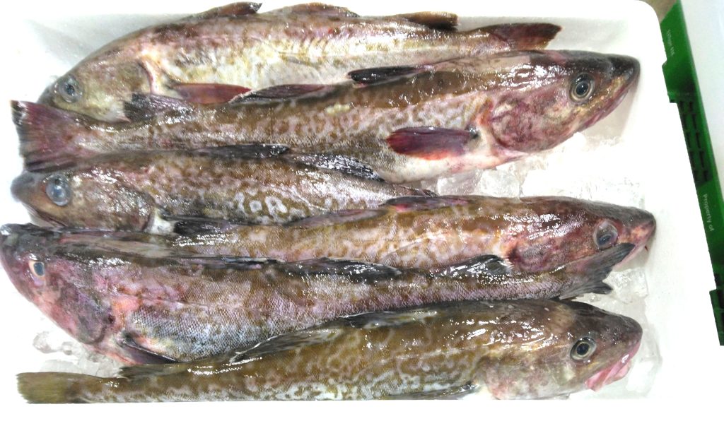 スケソウダラです。宮古産の6尾入り。1箱で6~7キロだそう。で、話はここから。そのお隣には、ほぼ同サイズのマダラもあったんですよ。