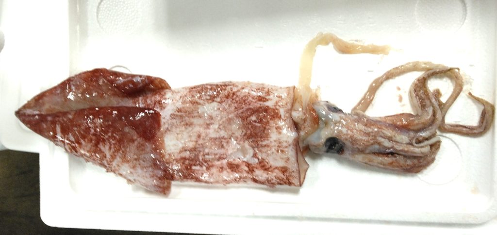 ドスイカです。この写真は合体させたもの。ドスヌキと書かれたツボ抜きイカと、ドス足と書かれたイカゲソをくっ付けたんですよ。どちらも水氷入りの5キロでした。ツボ抜きの胴の部分だけでおよそ30センチ。見事なものですね。どうしても皮がやわらかくてキズ付きやすいので、なんとなく見た目がね、よろしくないんですが。逆に言うと皮を剥きやすい、という事かも。水分が多くて鮮度落ちが早いので、刺身には向かないようですね。でも、産地では刺身で食べる事も多くて、イカらしい旨味も十分味わえる、とのこと。さすがに市場に出荷されたものに関しては、難しいでしょうがね。焼きイカやから揚げなんかがおすすめでしょうか。中華もいいかもよ。