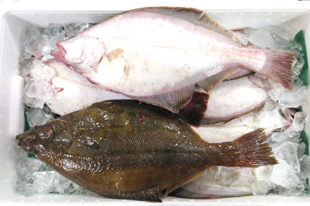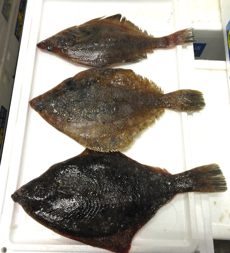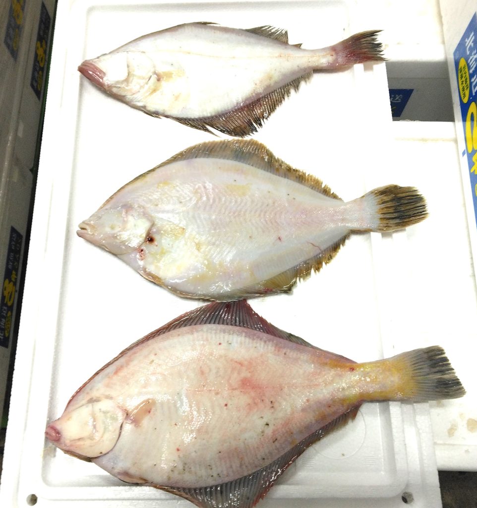 北海道産カレイの3連発。皆さん、区別つきます? モリ介はう~ん、怪しい。下のヤツがマガレイ、ってのはなんとか。正解をお教えしましょう。上がソウハチガレイ、真ん中がアサバガレイ。そして下がマガレイです。ソウハチ、アサバが岩内産。岩内は北海道の積丹半島の西側の付け根のあたり。そしてマガレイは利尻産でした。重量はそれぞれで5キロとか6キロ、尾数も13尾から18尾ぐらい。眼の付いてる側も見てみます?