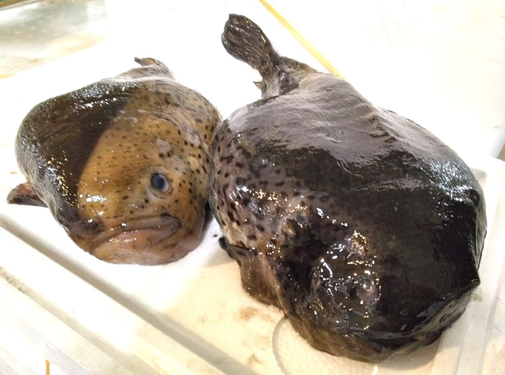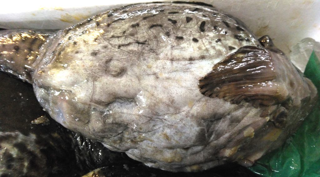 このお魚はゴッコ。標準和名ホテイウオです。右がメスで4尾入りの5.5キロ。左がオスで4尾入りの4キロでありました。産地は北海道の噴火湾とのこと。左のオスは体表の模様、半分に分かれてますね。人の顔にも似た風貌がかわいらしい。ベテランのお客さんに話を聞くと、当然商品化する時には魚をさばくんだけど、落とした頭に付いている目と目線があったりして、たまにびっくりすることがあるんだそう。ヌメリがすごいんで、塩を振ってヌメリを浮かせた後で熱湯をかけるんだけど、身の部分が結構縮んでしまうんだとか。ヌメリ、確かにすごかったです。滑り止め付きの軍手をはめても一苦労。両手でつかむのも大変でした。産卵期を迎えてるので、卵が透けて見えたりしないのかな、とか思って、メスを裏返してみたんだけど…。