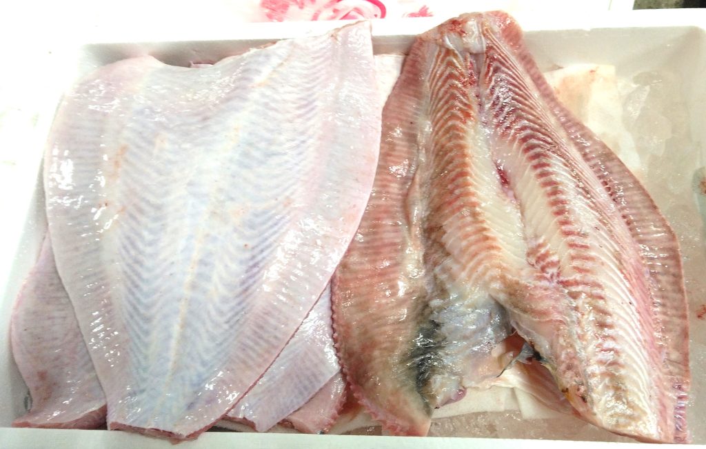 そう、頭と尾っぽを落として、皮をむくんです。市場の入荷としては、圧倒的に皮むき済みの商材の方が多いです。写真の魚は、宮古産の4枚入れの5キロでした。数字上は同じだけど、半身で、かつ、頭と尾っぽと皮の部分がないので、皮むき済みの方が圧倒的に大きいです。長さで言うと30センチはゆうにありました。このカレイを使った煮魚。本当に美味しいです。厚みもあるから、ソテーやムニエルでもいいかも。表側のピンクの部分しか普段は見ないけど、裏側はこんな感じでしたかね。もちろん中骨は外してあって、三枚おろし状態。調理も簡単だからおすすめ。あれ?小さいサイズは中骨、残ってたような気がするな~。また今度確認しておきますね。